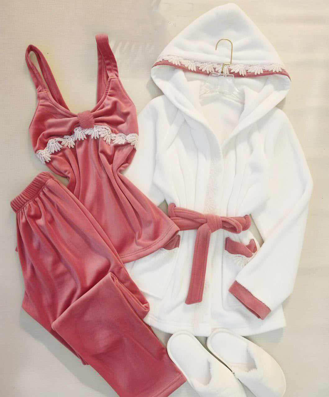 دلّلي نفسك بإطلالة أنيقة ومريحة في البيت مع هذه البيجامة الراقية المكوّنة من ثلاث قطع من ثوب الموبرة الناعم. تصميمها أنثوي جذّاب يجمع بين الفخامة والدفء، لتكون خيارك المثالي في ليالي الشتاء الباردة أو جلسات الاسترخاء في المنزل.