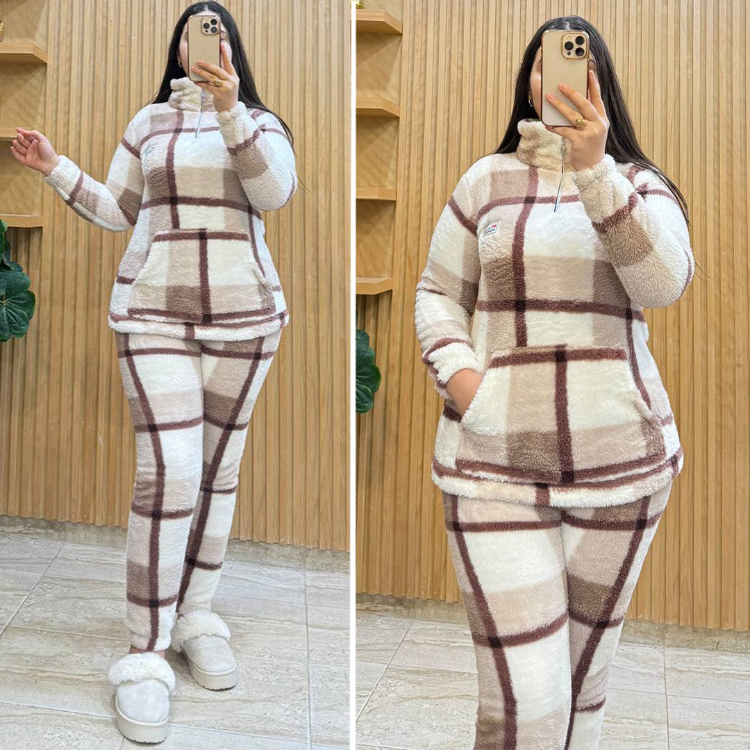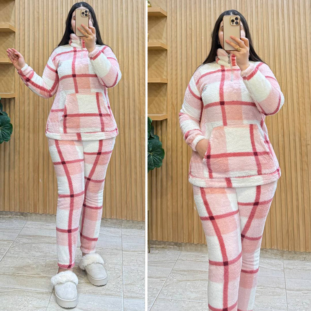 استمتعي بأقصى درجات الراحة والدفء مع هذه البيجامة النسائية الأنيقة، المصممة خصيصًا لتناسب أجواء فصل الشتاء والخريف. تأتي هذه البيجامة مكونة من قطعتين (بلوزة + بنطال)، بتصميم عصري بنقشة مربعات أنيقة تضيف لمسة أنوثة وعصرية في نفس الوقت.