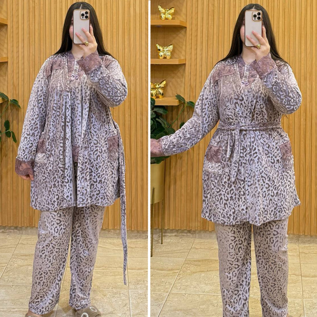 دلّلي نفسك بإطلالة أنيقة ومريحة في البيت مع هذه البيجامة الراقية المكوّنة من ثلاث قطع من ثوب الموبرة الناعم. تصميمها أنثوي جذّاب يجمع بين الفخامة والدفء، لتكون خيارك المثالي في ليالي الشتاء الباردة أو جلسات الاسترخاء في المنزل.